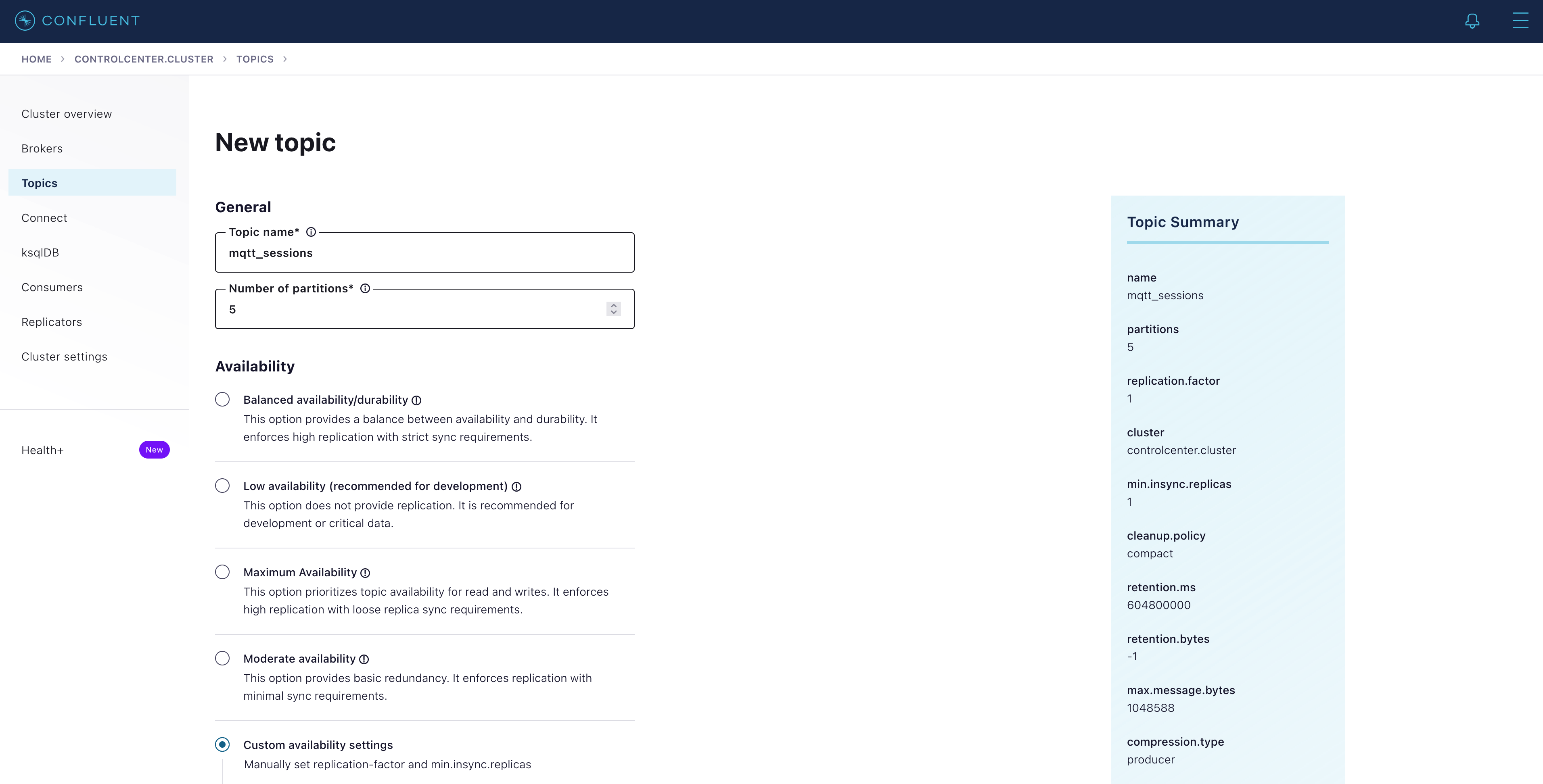 You can create the necessary Kafka topics using Confluent Control Center. Please note that the proposed settings are not suitable for production environments, and multiple Kafka topics can be used to store MQTT messages. Some settings can be customized in the Expert Configuration’s Customize Settings section. Refer to the image below for guidance: